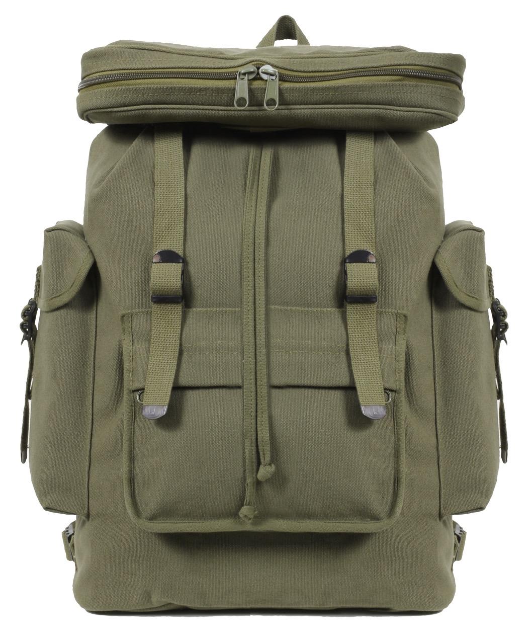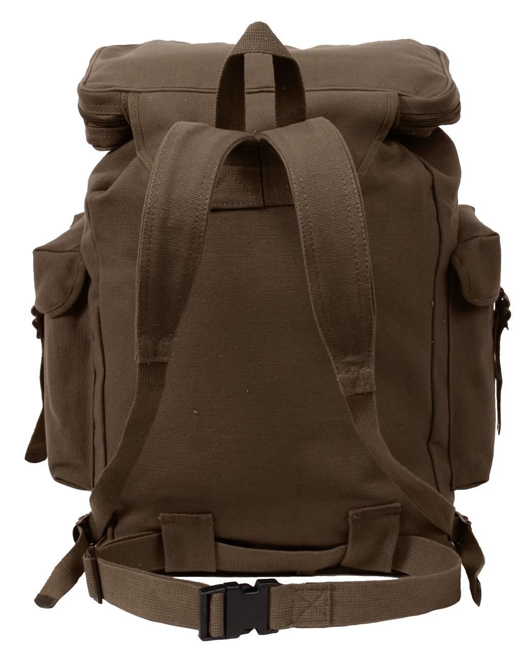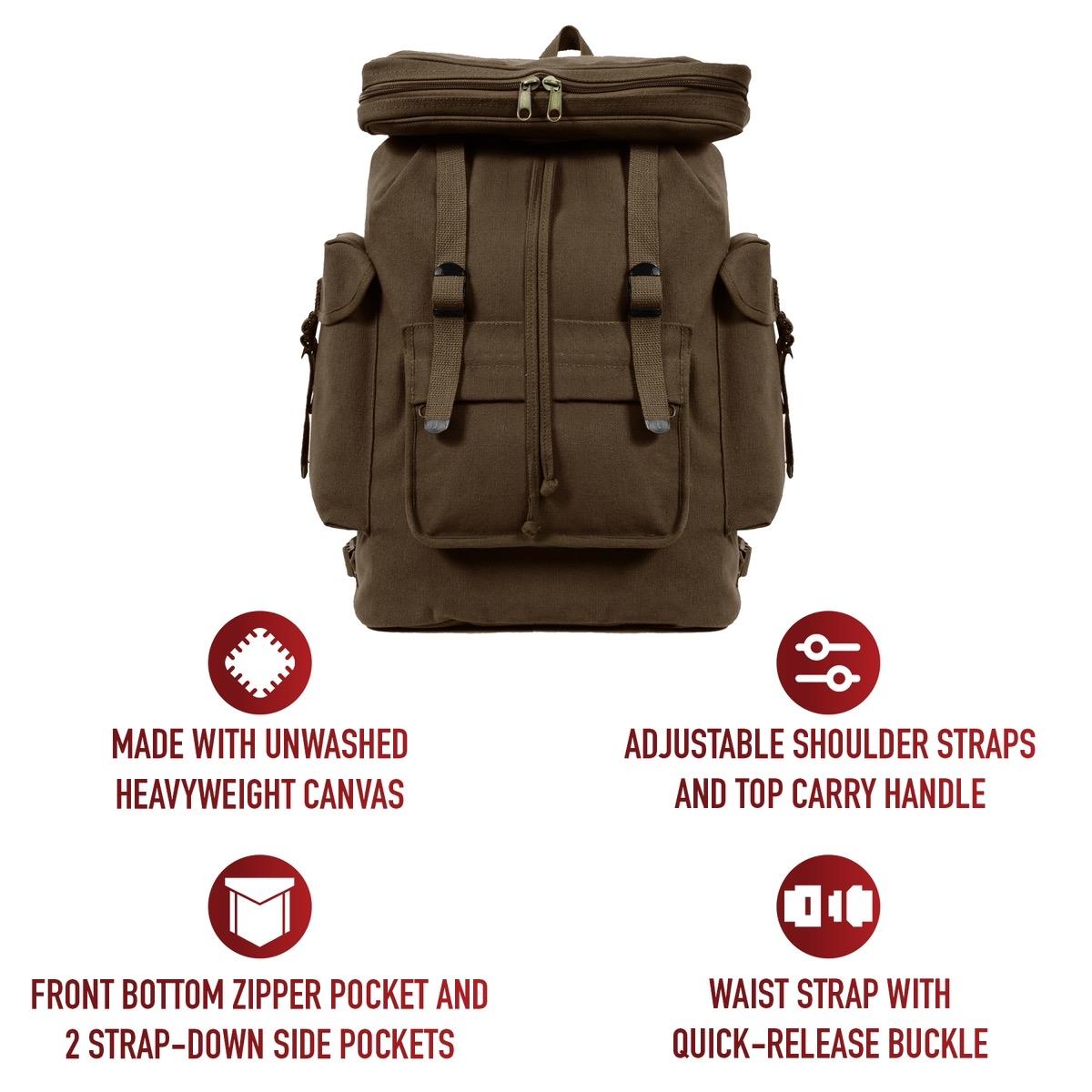 - Rothco's Canvas European Style Rucksack is your go-to backpack for versatile storage needs. With its multi-pocket design, this rucksack offers plenty of space, measuring approximately 20 inches x 13 inches x 7.5 inches. Whether you're heading out for a hike, a day trip, or just need a reliable everyday bag, this rucksack has you covered. It features a front bottom zipper pocket and 2 strap-down side pockets, providing convenient storage for additional gear and essentials. The adjustable shoulder straps ensure a comfortable fit, while the top carry handle offers alternative carrying options. For added stability and security, it also includes a waist strap with a quick-release buckle. Crafted from unwashed heavyweight canvas, this rucksack is built to withstand the rigors of everyday use and outdoor adventures. Whether you're exploring the urban jungle or venturing into the great outdoors, rely on Rothco's Canvas European Style Rucksack to keep your essentials organized and accessible. Made from Rothco’s durable heavyweight canvas fabric, this superior material is naturally water-resistant, rugged, and is built for the long haul. No one comes close to Rothco’s collection of ultra-premium canvas bags and packs.