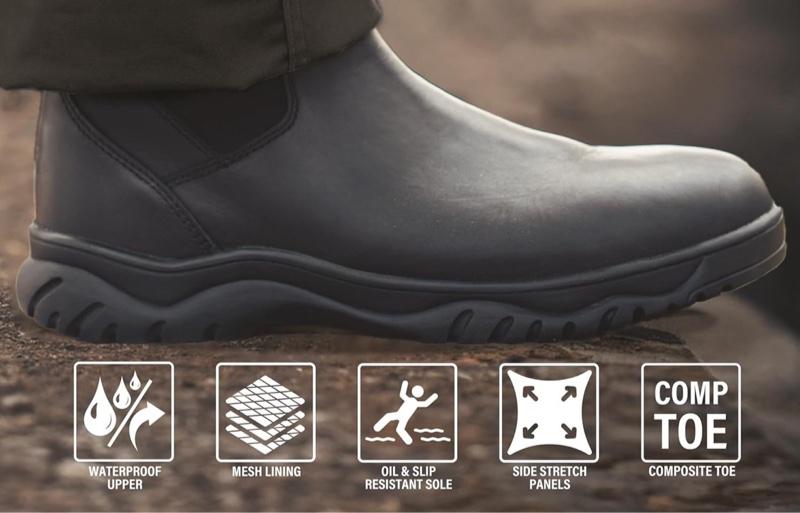 - Start your day right with a step forward in our Chelsea Work Boots. Designed with full grain waterproof leather uppers, these slip on work boots keep your feet dry from the elements, while offering all-day comfort that stays with you.