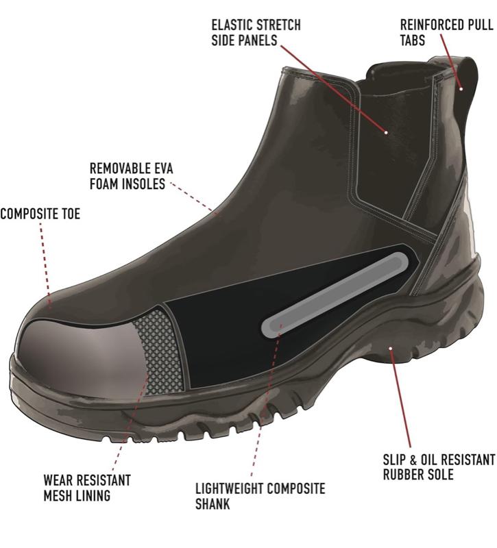 - Components: Reinforced Pull Tabs, Elastic Side Panels, Slip & Oil Resistant Rubber Sole, Wear Resistant Mesh Lining, Removable EVA Foam Insoles, Composite Shank