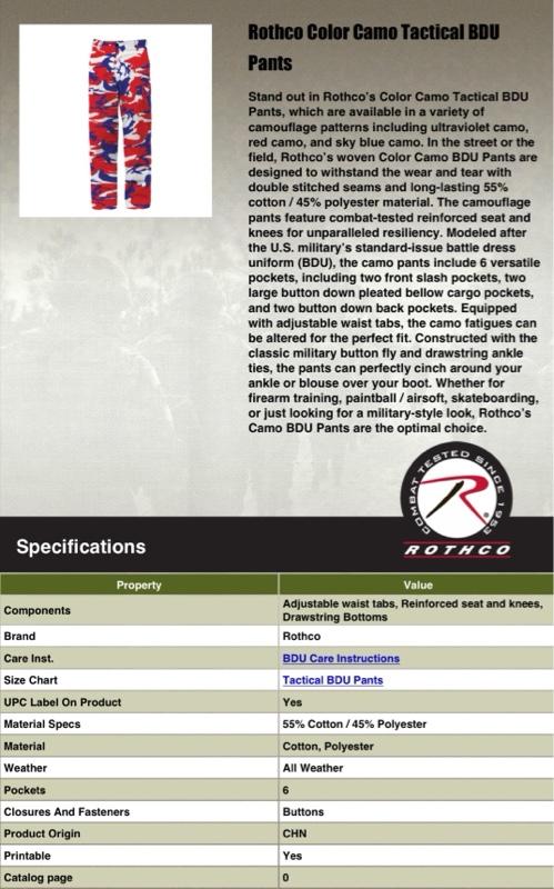 - Experience over 4 decades of trusted design with our Color Camo Tactical BDU Pants. Constructed from a robust cotton / polyester fabric blend, these cargo pants are built for unparalleled performance and comfort. Providing flexibility, strength, and plenty of pockets, these BDUs are not afraid to get down and dirty, standing up to tough challenges during field missions, tactical operations, law enforcement duties, and outdoor adventures.