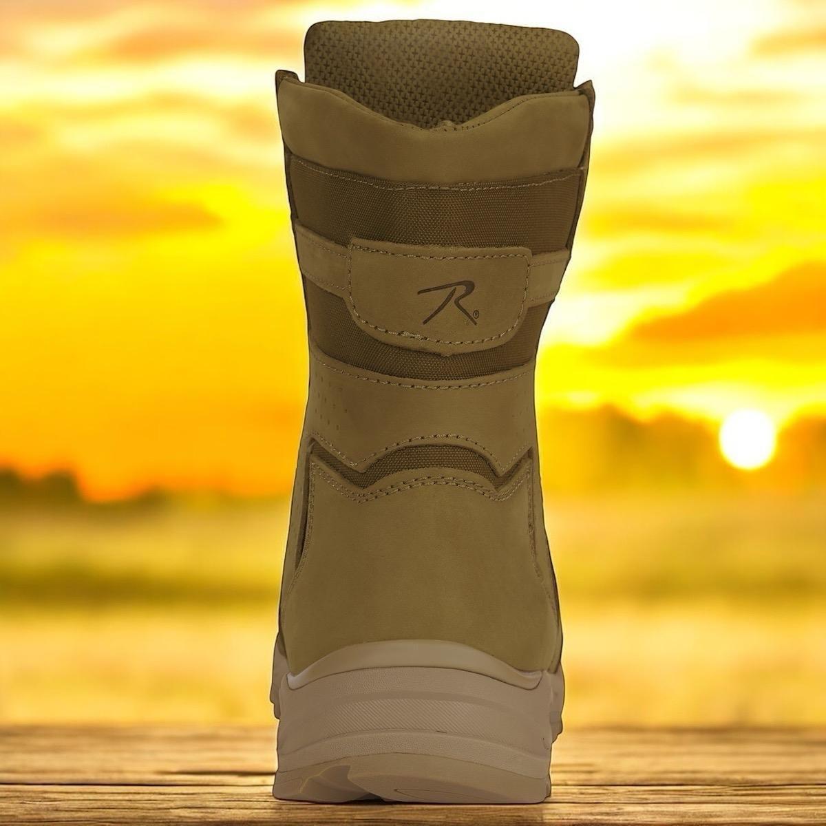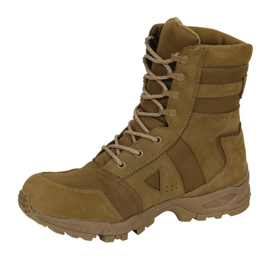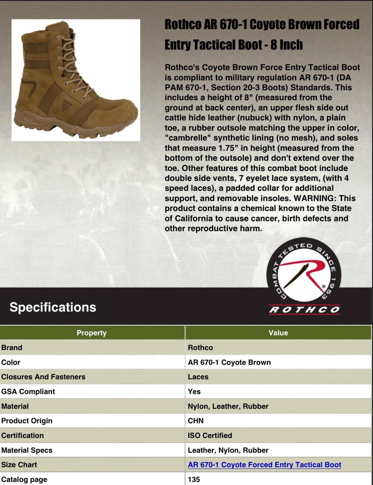 - Step into service-compliant excellence with Rothco's AR 670-1 Coyote Brown Forced Entry Boot. Designed to meet field standards, this boot ensures top-tier performance. With an 8-inch height measured from the ground at the back center, it combines optimal support with service precision. The upper is crafted from flesh side out cattle hide leather (nubuck) with durable nylon, providing a robust and reliable construction. The rubber outsole, matching the upper in color, offers superior traction and durability. The plain toe design adds a classic touch to the tactical boot. The Cambrelle synthetic lining, without mesh, enhances comfort and moisture control. The soles measure 1.75 inches in height, and double side vents contribute to breathable comfort, making it ideal for various demanding situations. Additionally, the padded collar provides extra support, ensuring a comfortable fit throughout your missions. Elevate your gear with Rothco's AR 670-1 Coyote Brown Forced Entry Boot. Designed with precision and built to withstand the harshest conditions, Rothco's collection of footwear and accessories combines durability, functionality, and unparalleled performance. From our Forced Entry Series which features our speedlace and waterproof technologies, to our V-Max Collection designed with lightweight running shoe soles, our diverse range of footwear provides unmatched comfort and protection for everyone from active-duty personnel to outdoor enthusiasts. With a rich heritage spanning over 7 decades, Rothco is the go-to brand for all things that keep you standing on your feet.