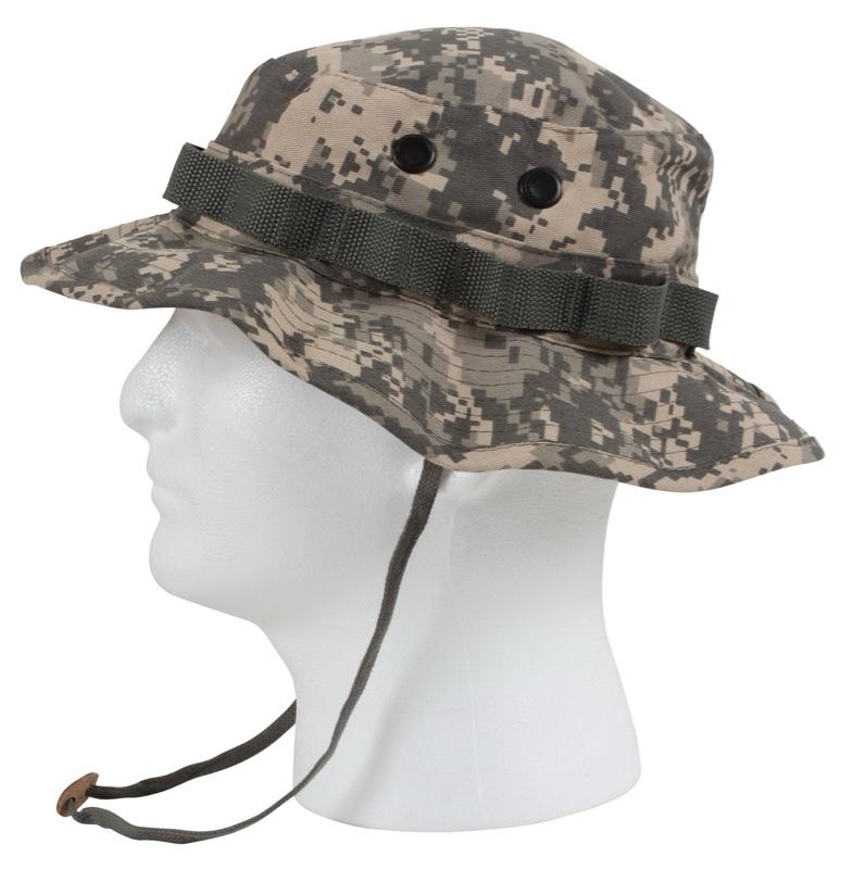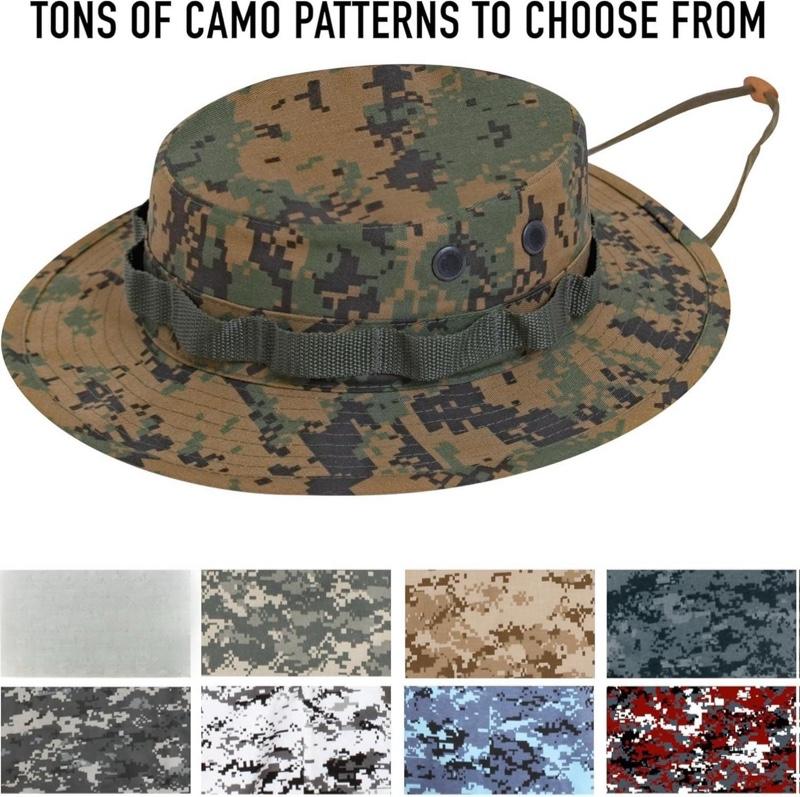 - Embrace the outdoors with our Digital Camo Boonie Hat! Crafted to professional specifications, this hat offers 360-degree sun defense. The wide, structured brim shades your neck and face, keeping you cool during outdoor activities. Made from a durable 55% cotton / 45% polyester blend, these hats withstand consistent outdoor use. Branch loops allow camouflaging with surroundings—perfect for hunting and bird watching. Four screened side vents circulate air, ensuring comfort. The adjustable chin strap secures the hat during windy days or on-the-go adventures. Dominate the sun with Rothco's Boonie Hat.