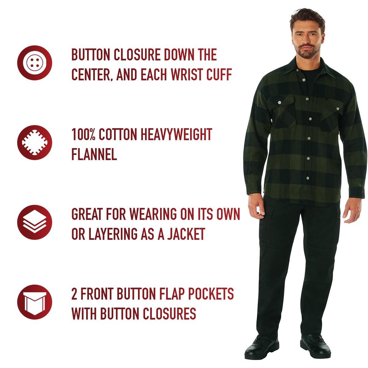 Rothco Extra Heavyweight Buffalo Plaid Flannel Long Sleeve Shirt - Men's Casual Red And Black Plaid Flannel, Casual Menswear Flannel With Pockets, 12 Different Colors Sizes Up To 5XL