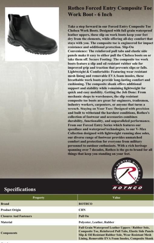 Rothco Forced Entry 6 Inch Composite Toe Boots Chelsea Work Boot Adult Black Comfort Footwear WorkWear Boot