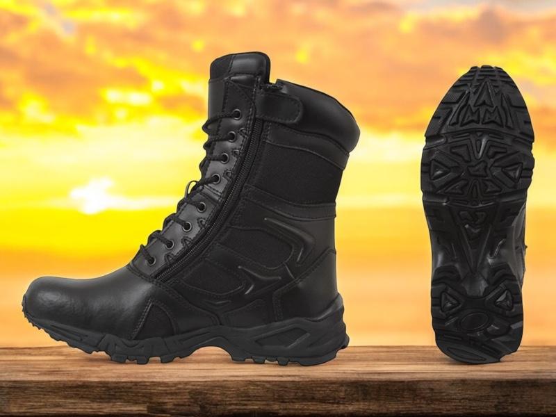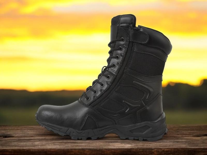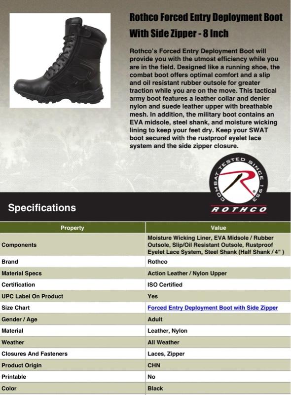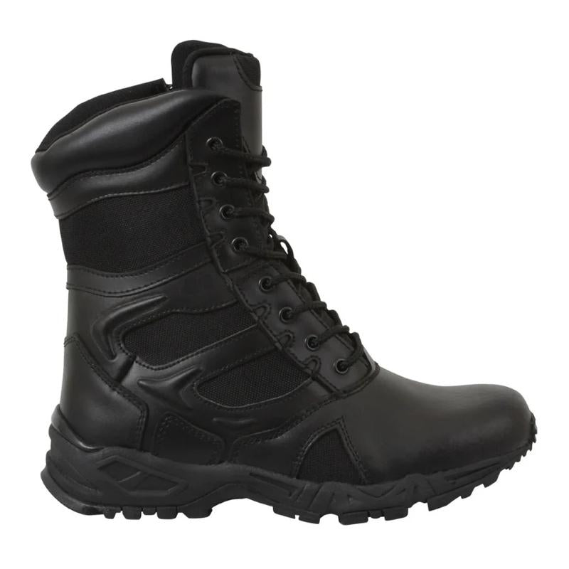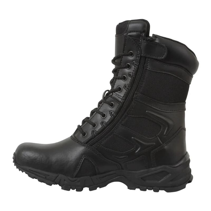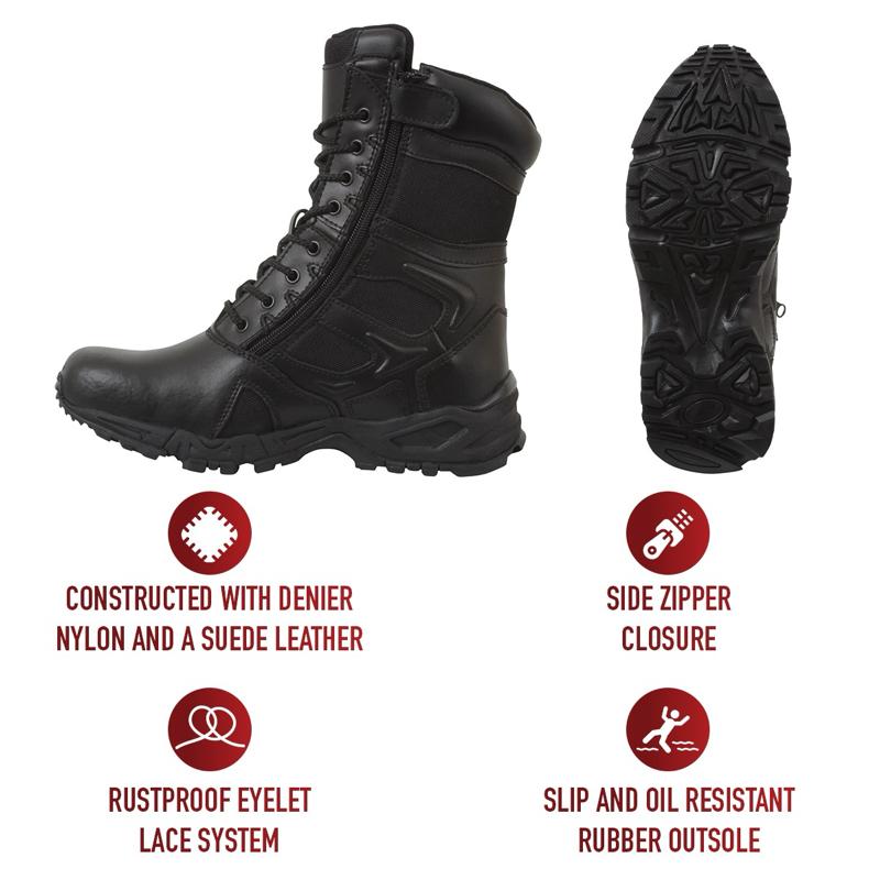 - Experience unmatched comfort and efficiency with Rothco's Forced Entry 8-inch Deployment Boots. These boots combine the comfort of a running shoe with the durability of an active-duty boot. The mountaineer rubber outsole enhances traction for smooth movement. Save time with the side zipper closure and hook-and-loop tab, eliminating the need to tie and untie laces. The rustproof eyelet lace system keeps your tactical boots securely in place. Constructed with denier nylon, suede leather, and breathable mesh, these boots keep your feet cool and dry. The padded collar ensures a comfortable fit, and the EVA midsole and steel shank provide extra support. Elevate your tactical experience with Rothco's premium deployment boots. Designed with precision and built to withstand the harshest conditions, Rothco's collection of footwear and accessories combines durability, functionality, and unparalleled performance. From our Forced Entry Series which features our speedlace and waterproof technologies, to our V-Max Collection designed with lightweight running shoe soles, our diverse range of footwear provides unmatched comfort and protection for everyone from active-duty personnel to outdoor enthusiasts. With a rich heritage spanning over 7 decades, Rothco is the go-to brand for all things that keep you standing on your feet.