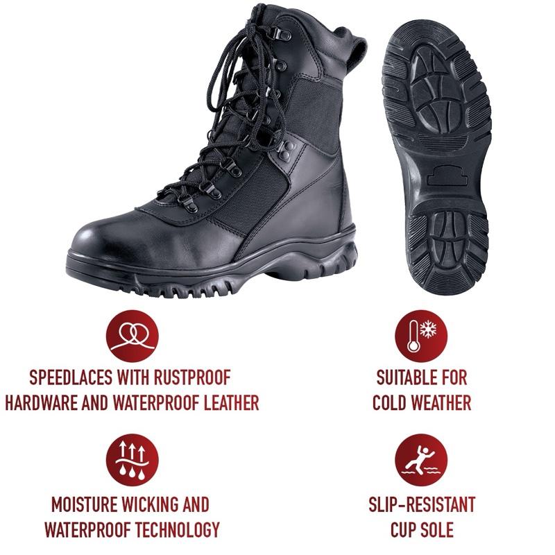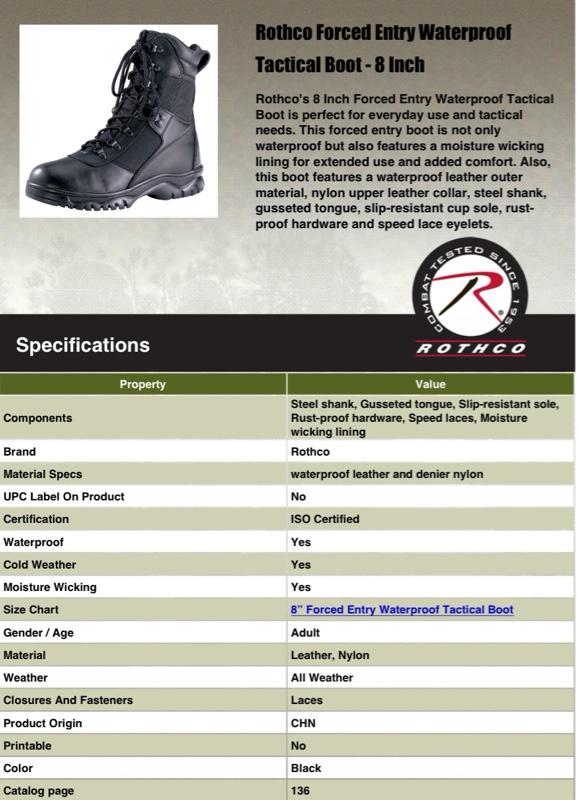 - Experience superior performance with Rothco's 8-Inch Forced Entry Waterproof Tactical Boot. Designed for everyday use and tactical needs, this rugged boot combines cutting-edge features. The moisture-wicking and waterproof technology, along with a gusseted tongue, ensures all-day comfort and protection. With a waterproof leather outer material, rust-proof hardware, and a slip-resistant cup sole, this boot delivers durability and stability in any environment. The speed laces with rustproof hardware make for quick adjustments.