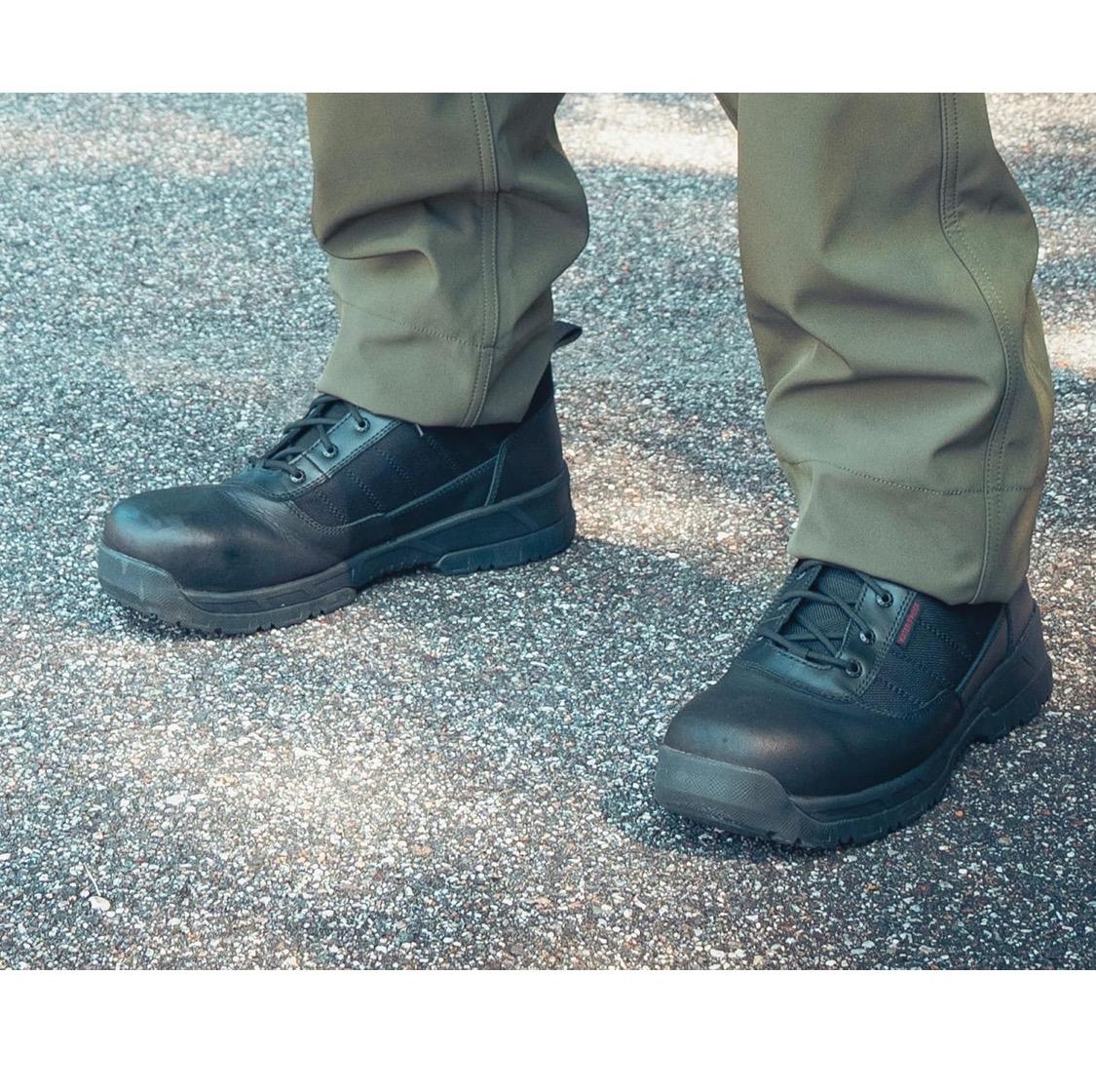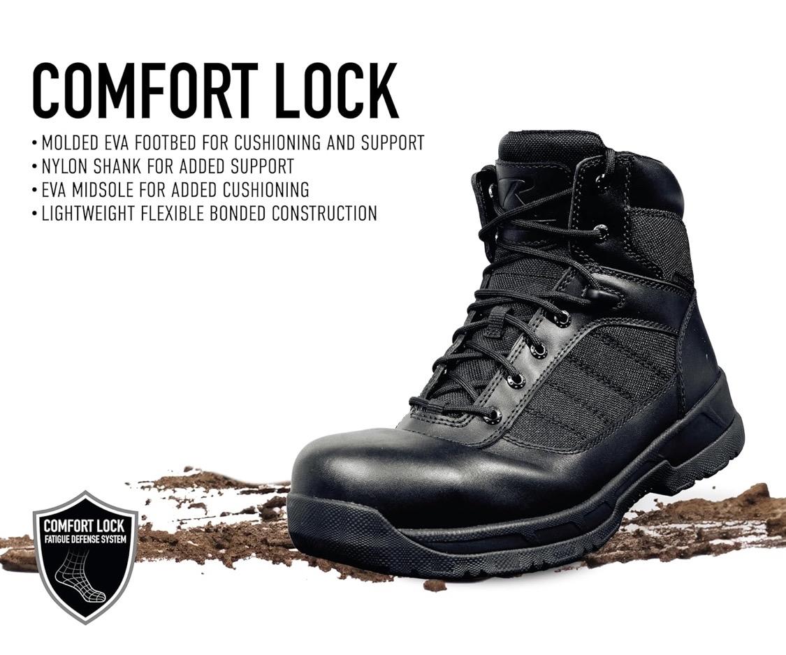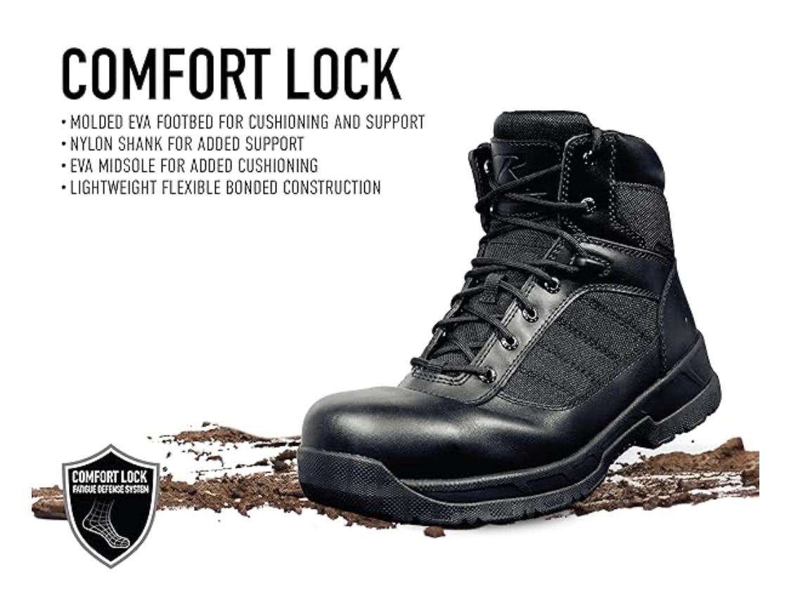 - Comfort Lock Fatigue Defense System: The Molded EVA Footbed And EVA Midsole Help Absorb Shock, Cushioning Your Feet From Impact While Providing All-Day Comfort. These Composite Toe Tactical Boots Feature A Lightweight Flexible Cement Construction And A Nylon Shank For Added Support And Stability.