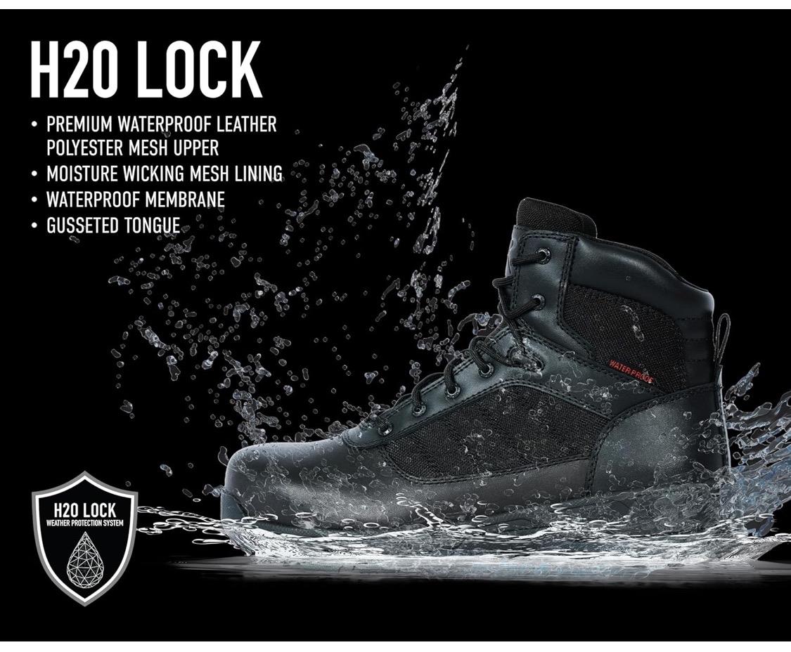 - H2O Lock Weather Protection System: Featuring A Premium Waterproof Leather And Polyester Upper, These Tactical Boots Ensure Your Feet Stay Dry, No Matter The Environment. The Comp Toe Boot Utilizes A Waterproof Internal Lining For Added Protection, With A Moisture Wicking Mesh Liner Underneath For Breathability While Keeping Water Out. The Gusseted Tongue Helps Shield Your Foot From Dirt And Debris.
