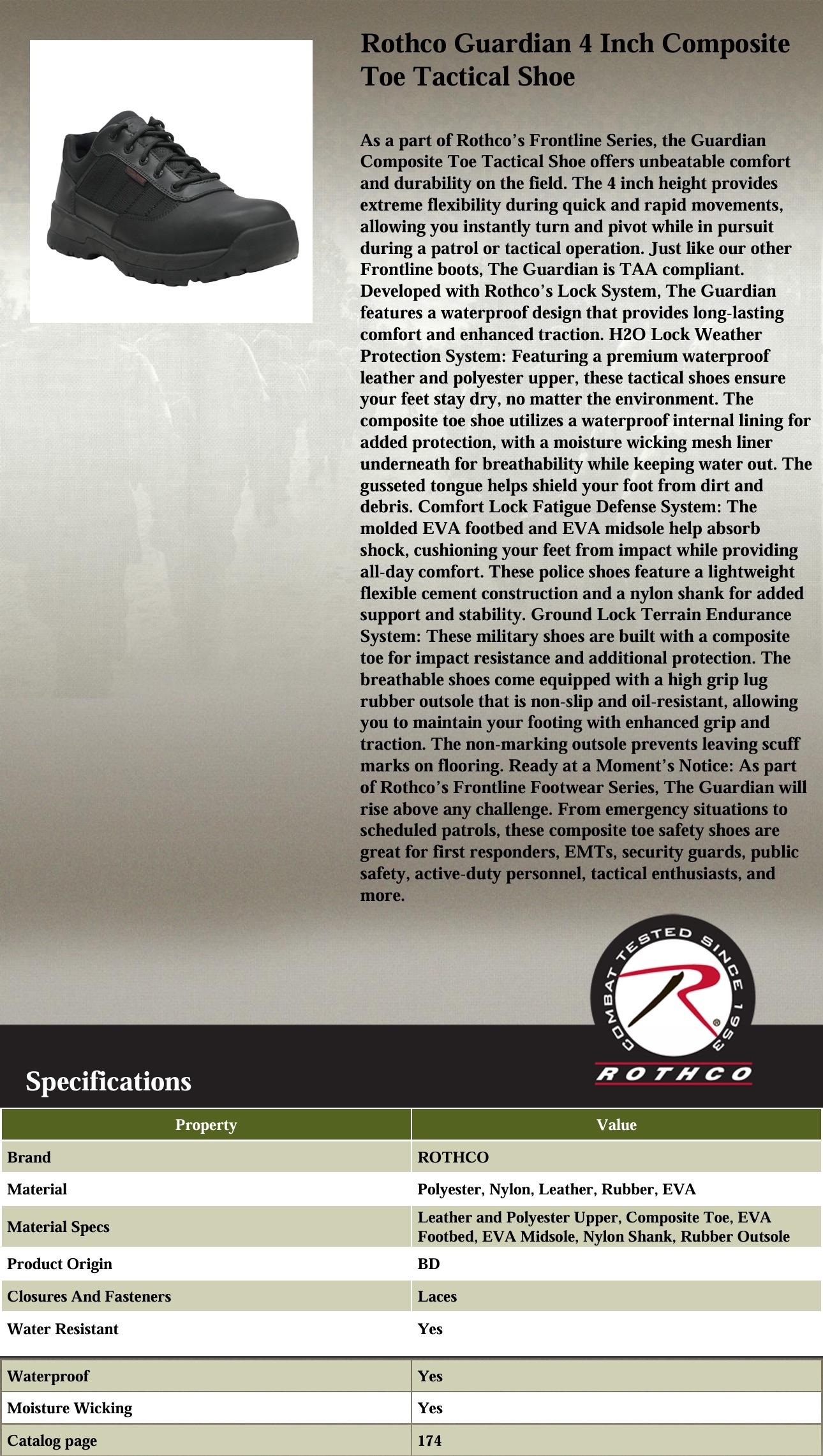 - As a part of Rothco’s Frontline Series, the Guardian Composite Toe Tactical Shoe offers unbeatable comfort and durability on the field. The 4-inch height provides extreme flexibility during quick and rapid movements, allowing you to instantly turn and pivot while in pursuit during a patrol or tactical operation.