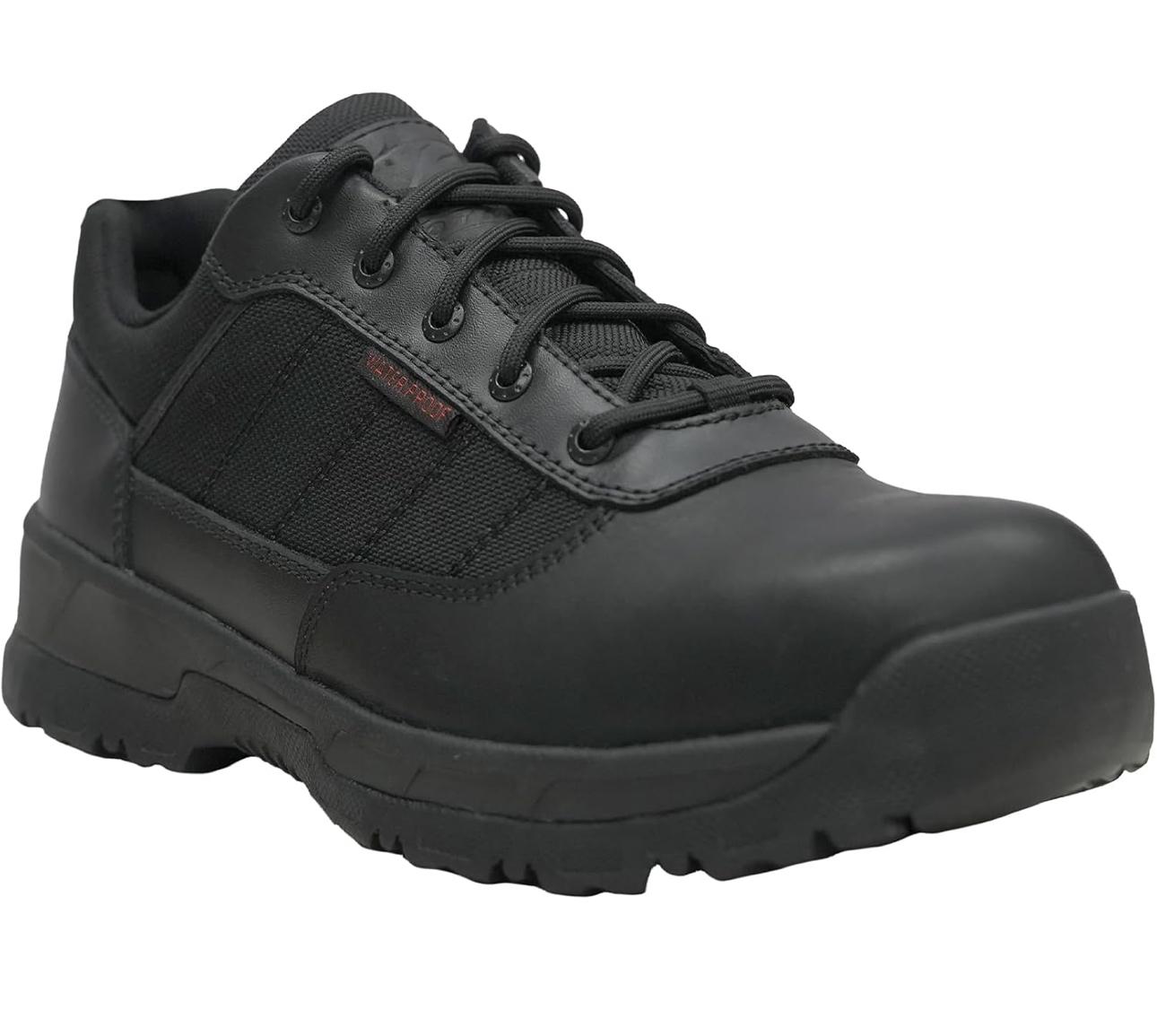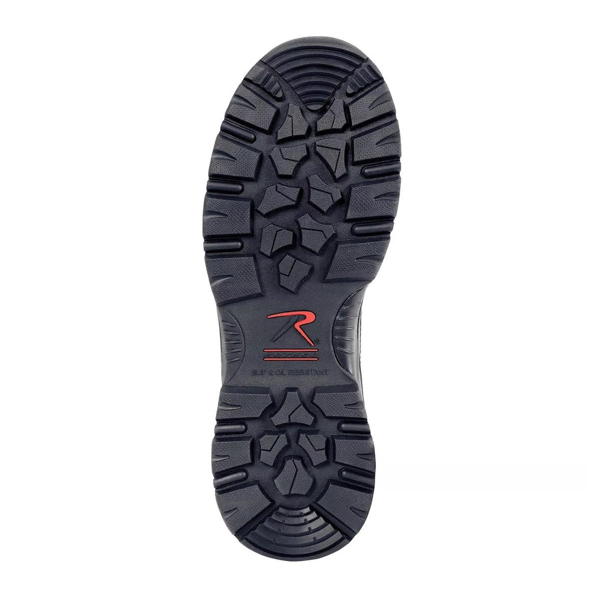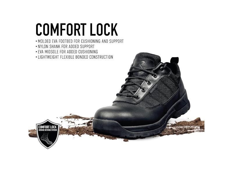 - As a part of Rothco’s Frontline Series, the Guardian Composite Toe Tactical Shoe offers unbeatable comfort and durability on the field. The 4 inch height provides extreme flexibility during quick and rapid movements, allowing you instantly turn and pivot while in pursuit during a patrol or tactical operation. Just like our other Frontline boots, The Guardian is TAA compliant. Developed with Rothco’s Lock System, The Guardian features a waterproof design that provides long-lasting comfort and enhanced traction. H2O Lock Weather Protection System: Featuring a premium waterproof leather and polyester upper, these tactical shoes ensure your feet stay dry, no matter the environment. The composite toe shoe utilizes a waterproof internal lining for added protection, with a moisture wicking mesh liner underneath for breathability while keeping water out. The gusseted tongue helps shield your foot from dirt and debris. Comfort Lock Fatigue Defense System: The molded EVA footbed and EVA midsole help absorb shock, cushioning your feet from impact while providing all-day comfort. These police shoes feature a lightweight flexible cement construction and a nylon shank for added support and stability. Ground Lock Terrain Endurance System: These military shoes are built with a composite toe for impact resistance and additional protection. The breathable shoes come equipped with a high grip lug rubber outsole that is non-slip and oil-resistant, allowing you to maintain your footing with enhanced grip and traction. The non-marking outsole prevents leaving scuff marks on flooring. Ready at a Moment’s Notice: As part of Rothco’s Frontline Footwear Series, The Guardian will rise above any challenge. From emergency situations to scheduled patrols, these composite toe safety shoes are great for first responders, EMTs, security guards, public safety, active-duty personnel, tactical enthusiasts, and more.