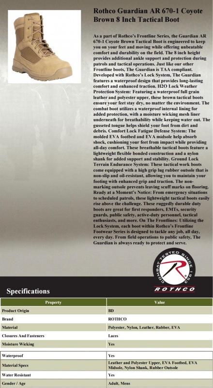 - As a part of Rothco’s Frontline Series, the Guardian AR 670-1 Coyote Brown Tactical Boot is engineered to keep you on your feet and moving while offering unbeatable comfort and durability on the field. The 8 inch height provides additional ankle support and protection during patrols and tactical operations. Just like our other Frontline boots, The Guardian is TAA compliant. Developed with Rothco’s Lock System, The Guardian features a waterproof design that provides long-lasting comfort and enhanced traction.