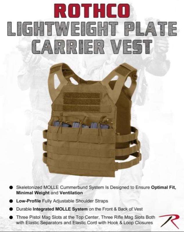 - Experience excellence with Rothco's Lightweight Plate Carrier Vest. Weighing just over a pound, this vest redefines lightweight performance without compromising on functionality. The skeletonized MOLLE cummerbund system ensures minimal weight and optimal airflow, enhancing your mobility and comfort.