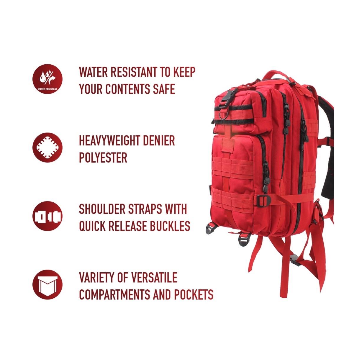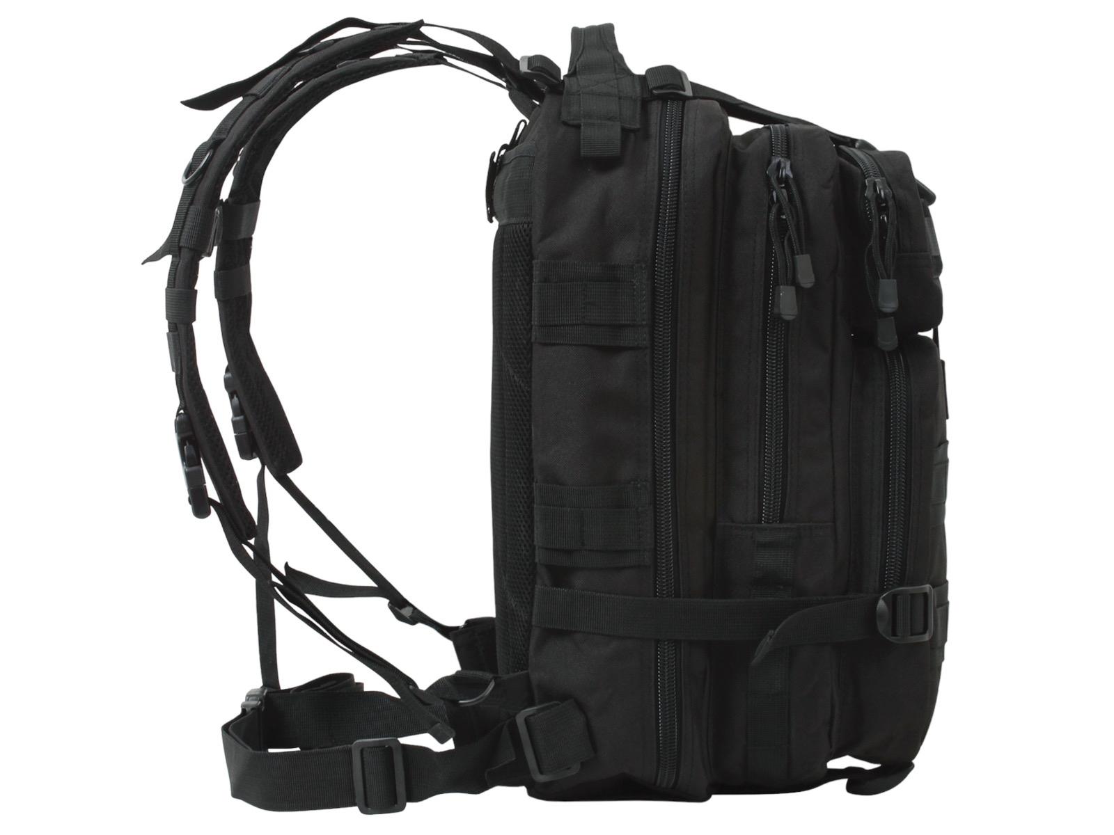 •Our Medium Transport Pack features a main compartment with a zippered pouch and mesh pocket, and 3 additional zippered storage compartments, all equipped with large two-way zippers for full access to your tactical gear and outdoor supplies. The tactical backpack has a 25L capacity and measures 17 inch x 10 inch x 9 inch, providing ample storage space for EDC essentials. The military backpack is great for going to the range, trekking out into the great outdoors, or stocking up as a bug out bag. Rugged Construction: Engineered with polypropylene webbing and 600D polyester, these medium transport packs are built tough, withstanding strenuous activities while in the field. In addition, the storage compartments feature heavy-duty zippers and water-repellent lining. Ready for Action: The survival bag comes equipped with sternum straps and waist strap for weight distribution when carrying heavy loads. The compression straps provide additional adjustment when traveling. The get home bag features quick-release buckles for rapid and easy on/off. Versatile Carry Options: