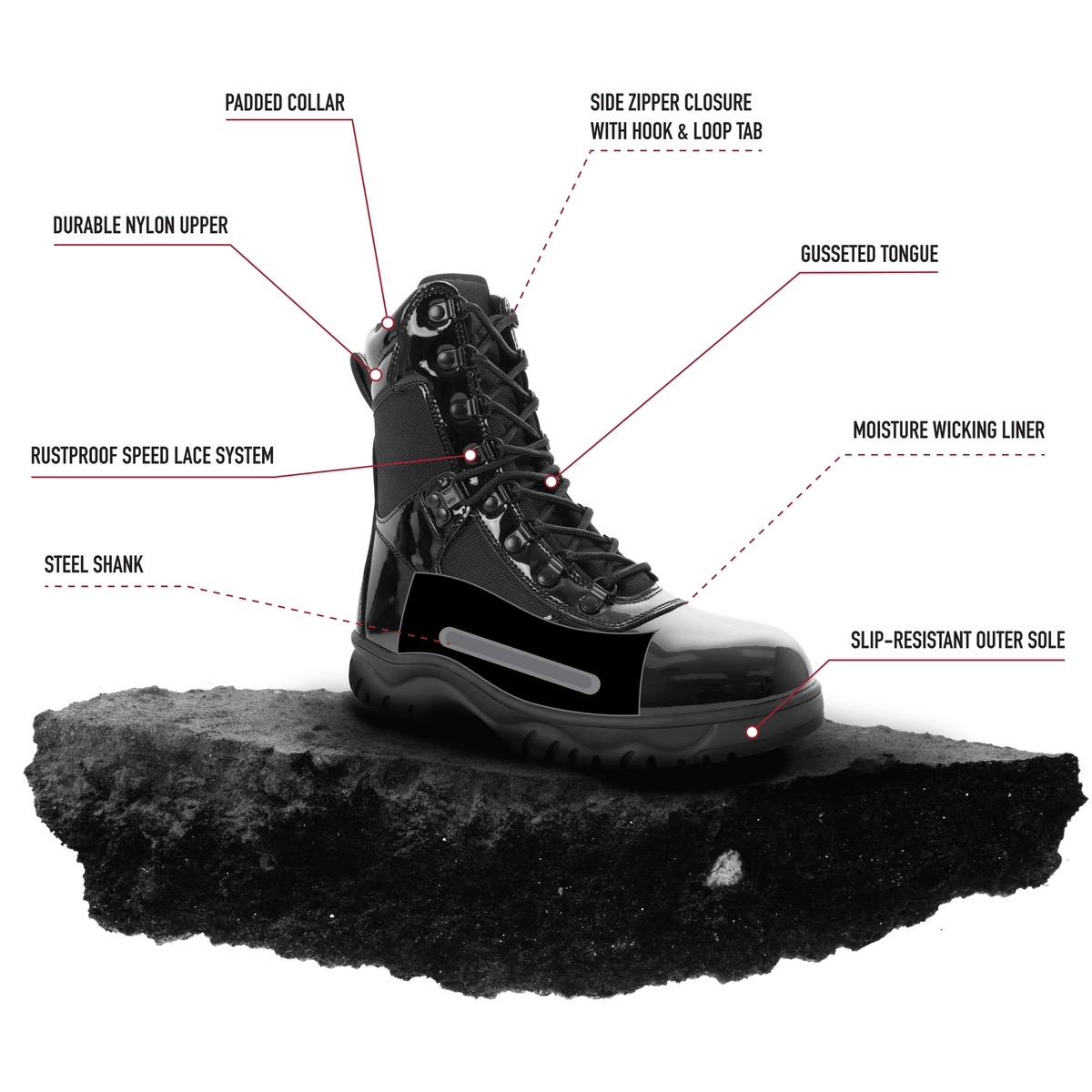 - Professional Appearance & Performance: Our Forced Entry High-Gloss Tactical Boot With Side Zipper Features An Inspection-Ready Mirror Finish That Looks Great While Out On Patrol. From Police Officers And Public Safety Personnel To Security Guards, These Tactical Duty Boots Ensure Your Uniform Remains Looking Sharp.