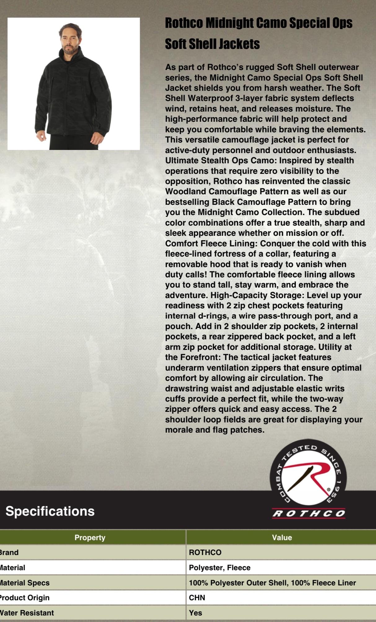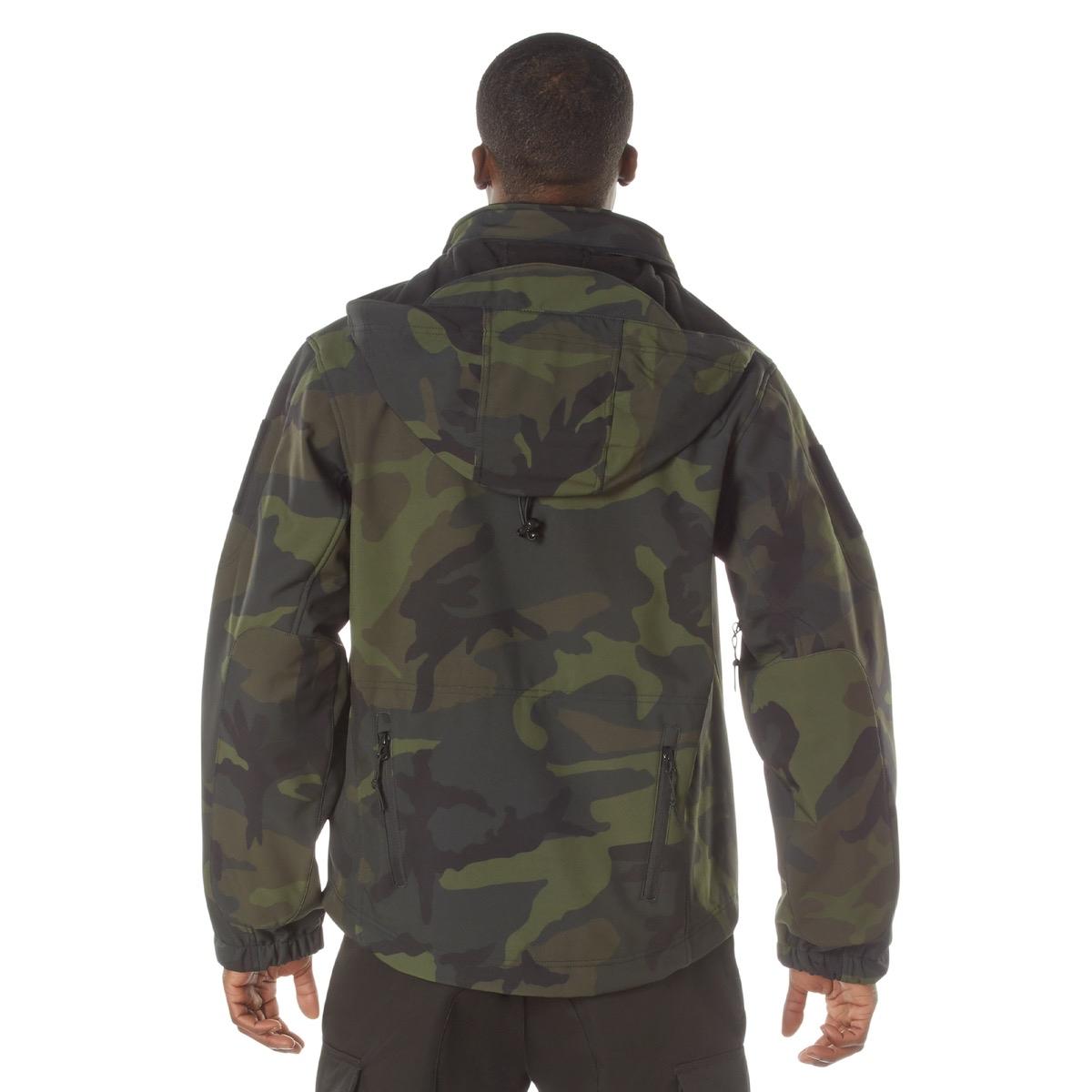 - As part of Rothco’s rugged Soft Shell outerwear series, the Midnight Camo Special Ops Soft Shell Jacket shields you from harsh weather. The Soft Shell Waterproof 3-layer fabric system deflects wind, retains heat, and releases moisture. The high-performance fabric will help protect and keep you comfortable while braving the elements. This versatile camouflage jacket is perfect for active-duty personnel and outdoor enthusiasts.