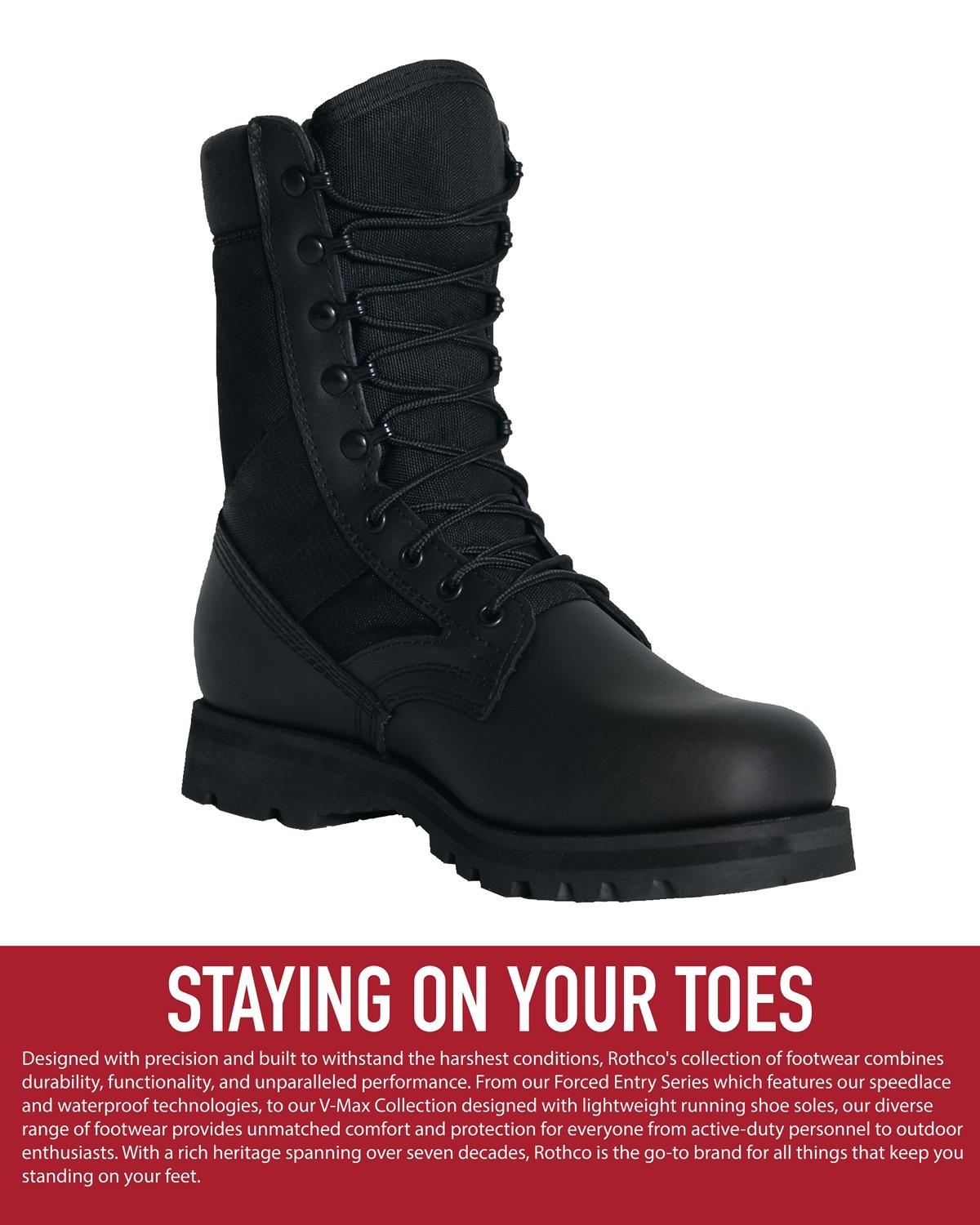 - Designed with precision and built to withstand the harshest conditions, Rothco's footwear collection combines durability, functionality, and unparalleled performance. From our Forced Entry Series, which features our speed lace and waterproof technologies, to our V-Max Collection, designed with lightweight running shoe soles, our diverse range of footwear provides unmatched comfort and protection for everyone from active-duty personnel to outdoor enthusiasts. With a rich heritage spanning over seven decades, Rothco is the go-to brand for all things that keep you standing on your feet.