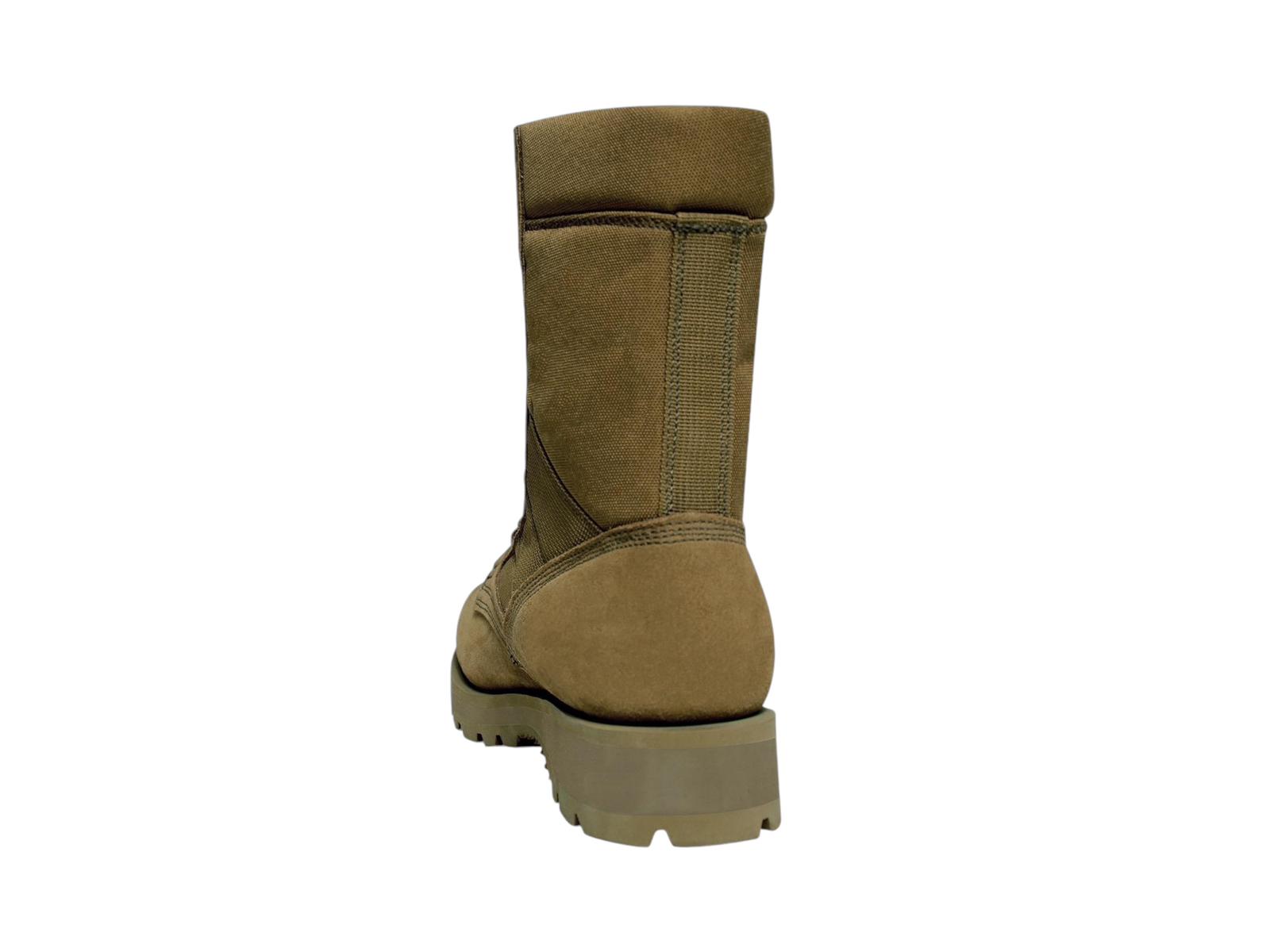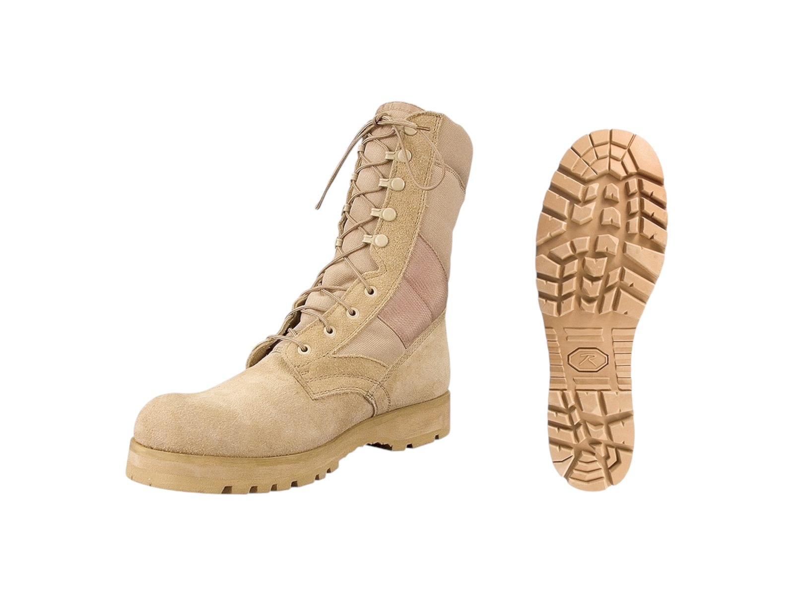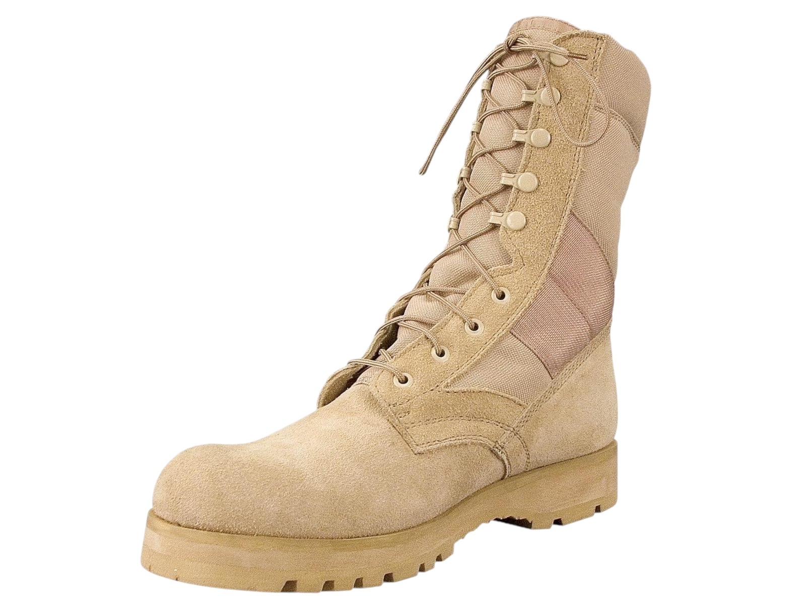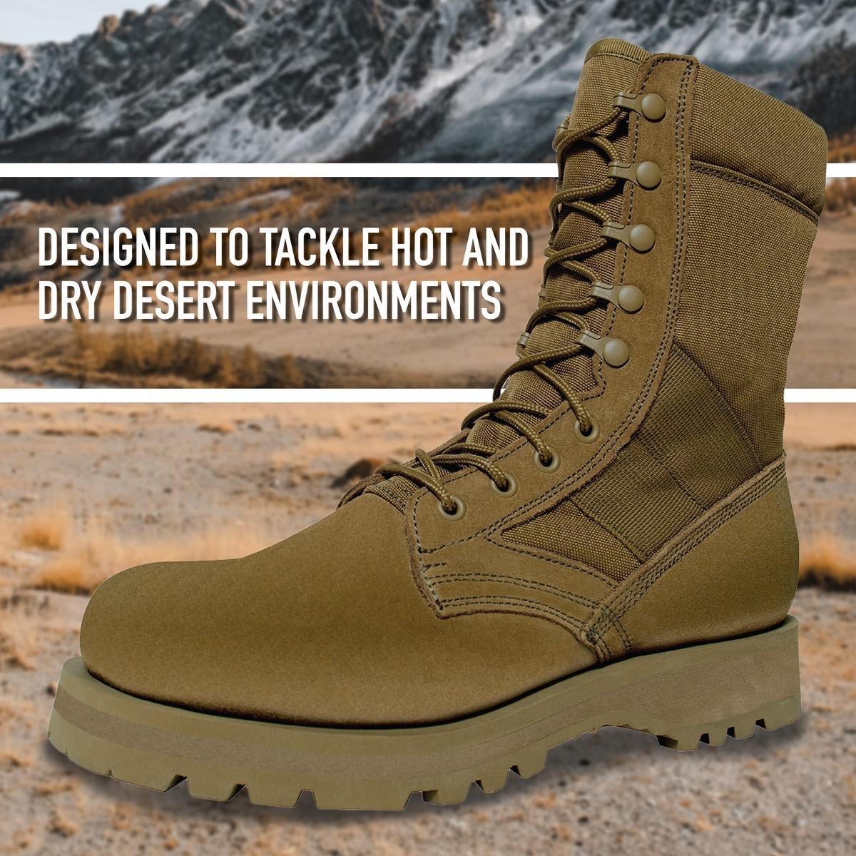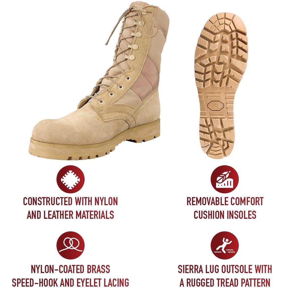 - The military field boot's upper section is constructed with nylon and leather (Desert Tan is Suede Leather), providing unbeatable strength and durability. The boot’s midsole heat barrier keeps your feet cool and protected from harsh climates. The removable cushion insole ensures all-day comfort in the desert or other outdoor locations.