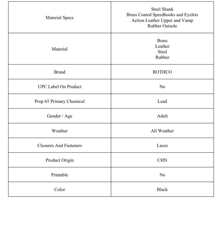 - Material Specs: Steel Shank, Brass Coated Speedhooks and Eyelets, Action Leather Upper and Vamp, Rubber Outsole