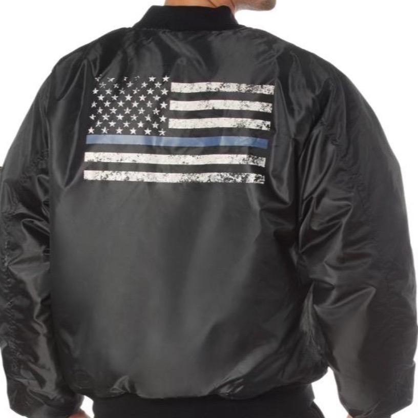 - Rothco's Thin Blue Line Flag MA-1 Flight Jacket. This classic flight jacket features a sleek design with a prominently displayed Thin Blue Line flag, symbolizing respect and solidarity with police and law enforcement officials. Crafted from a 100% nylon water-repellent outer shell, this bomber jacket is designed to keep you dry and comfortable in various weather conditions.