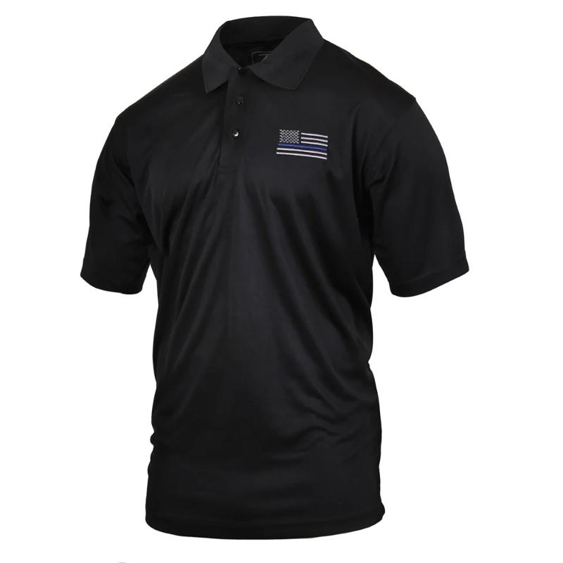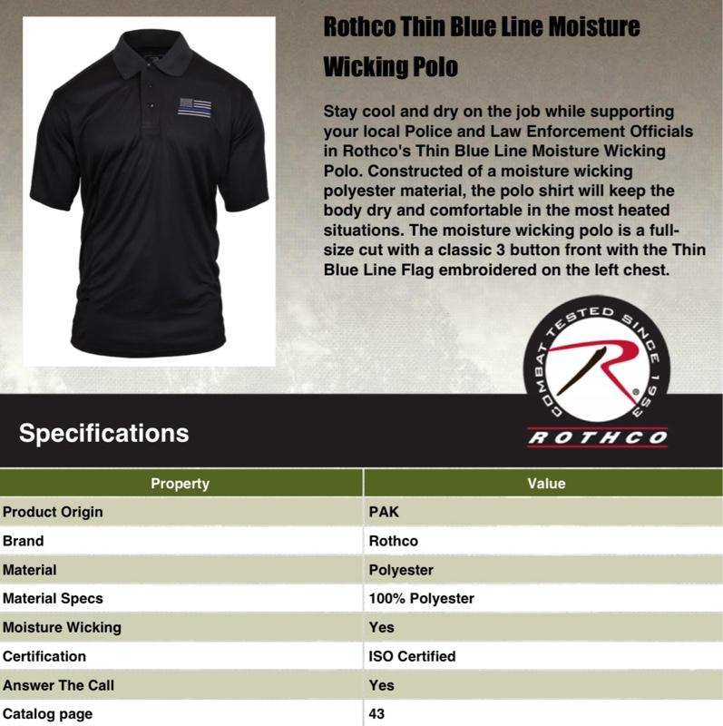 - Stay cool and dry on the job with Rothco's Thin Blue Line Moisture Wicking Polo. Made from 100% polyester fabric, this polo shirt is designed to wick away moisture, keeping you comfortable throughout your day. The Thin Blue Line flag embroidery on the left chest symbolizes respect and support for law enforcement. This polo features a classic 3-button collar for a professional look. Additionally, proceeds from this purchase benefit families of fallen first responders, making it a meaningful way to show your appreciation. The shirt's lightweight and breathable material ensures you stay cool and dry, whether on duty or during casual wear.
