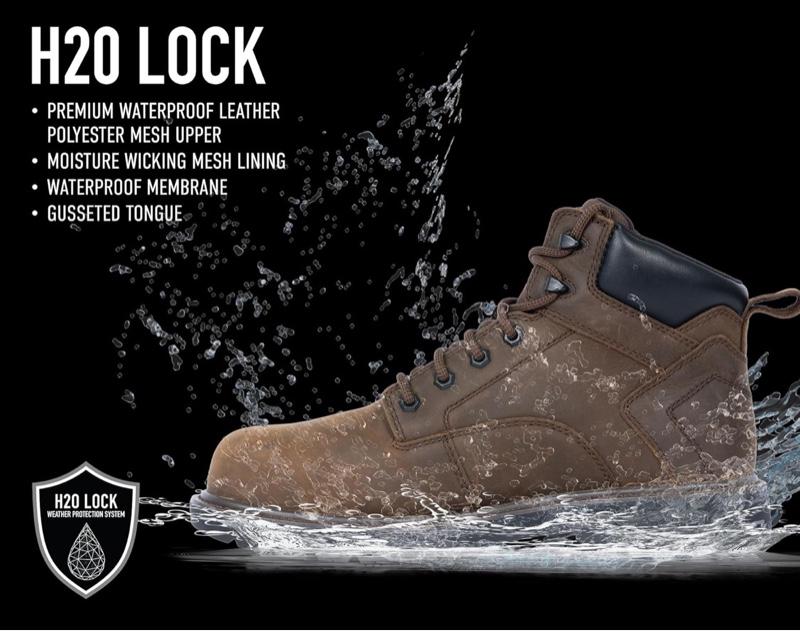 - H2O Lock Weather Protection System: Featuring A Premium Waterproof Leather And Polyester Upper, These Work Boots Ensure Your Feet Stay Dry, No Matter The Environment. The Lightweight Work Boot Utilizes A Waterproof Internal Lining For Added Protection, With A Moisture Wicking Mesh Liner Underneath For Breathability While Keeping Water Out. The Gusseted Tongue Helps Shield Your Foot From Dirt And Debris.