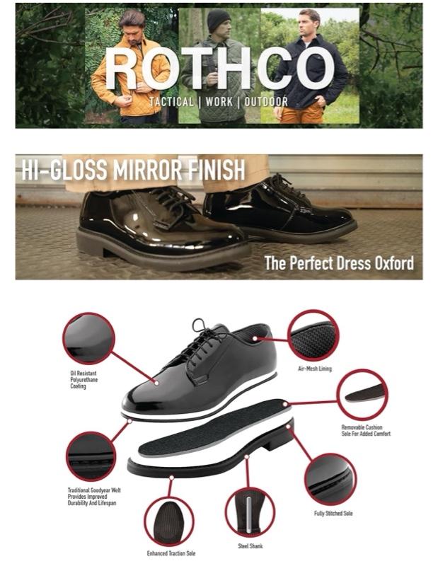 - Rothco's Uniform Hi-Gloss Oxford Dress Shoes offer a sleek, professional appearance without sacrificing comfort. The lightweight formal dress shoe provides the perfect inspection-ready mirror shine that will have you ready for duty. The cushioned sole provides added comfort, so you can wear them all day. And with fully stitched soles and a traditional Goodyear welt, they are built to last. Look professional at all times with Rothco's Hi-Gloss Dress Shoes – perfect for active duty, public safety professionals, students, or everyday wear.