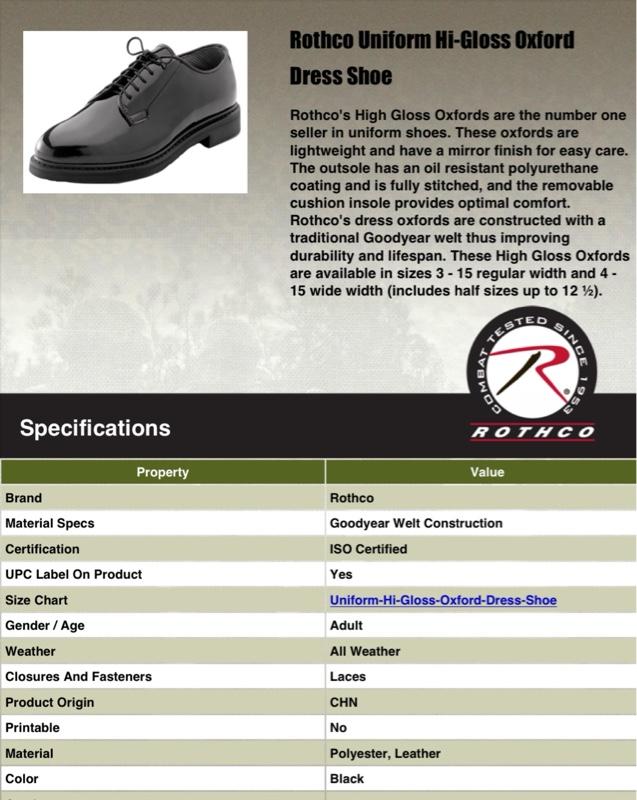 - Rothco's Uniform Hi-Gloss Oxford Dress Shoes offer a sleek, professional appearance without sacrificing comfort. The lightweight formal dress shoe provides the perfect inspection-ready mirror shine that will have you ready for duty. The cushioned sole provides added comfort so that you can wear them all day. And with fully stitched soles and a traditional Goodyear welt, they are built to last. Look professional at all times with our Hi-Gloss Dress Shoes – perfect for active duty, public safety professionals, students, or more.