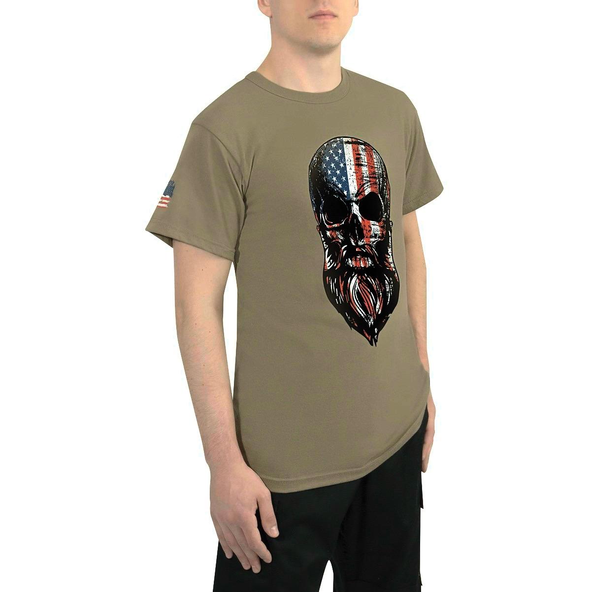 - Showcase your American spirit with Rothco’s US Flag Bearded Skull T-Shirt. This distinctive t-shirt features a patriotic bearded skull covered in the American flag on the front, making a bold statement. The right sleeve displays a distressed American flag oriented with the stars facing forward, an homage to service memebers. Crafted from a durable yet lightweight and breathable cotton blend, this t-shirt ensures comfort and longevity.