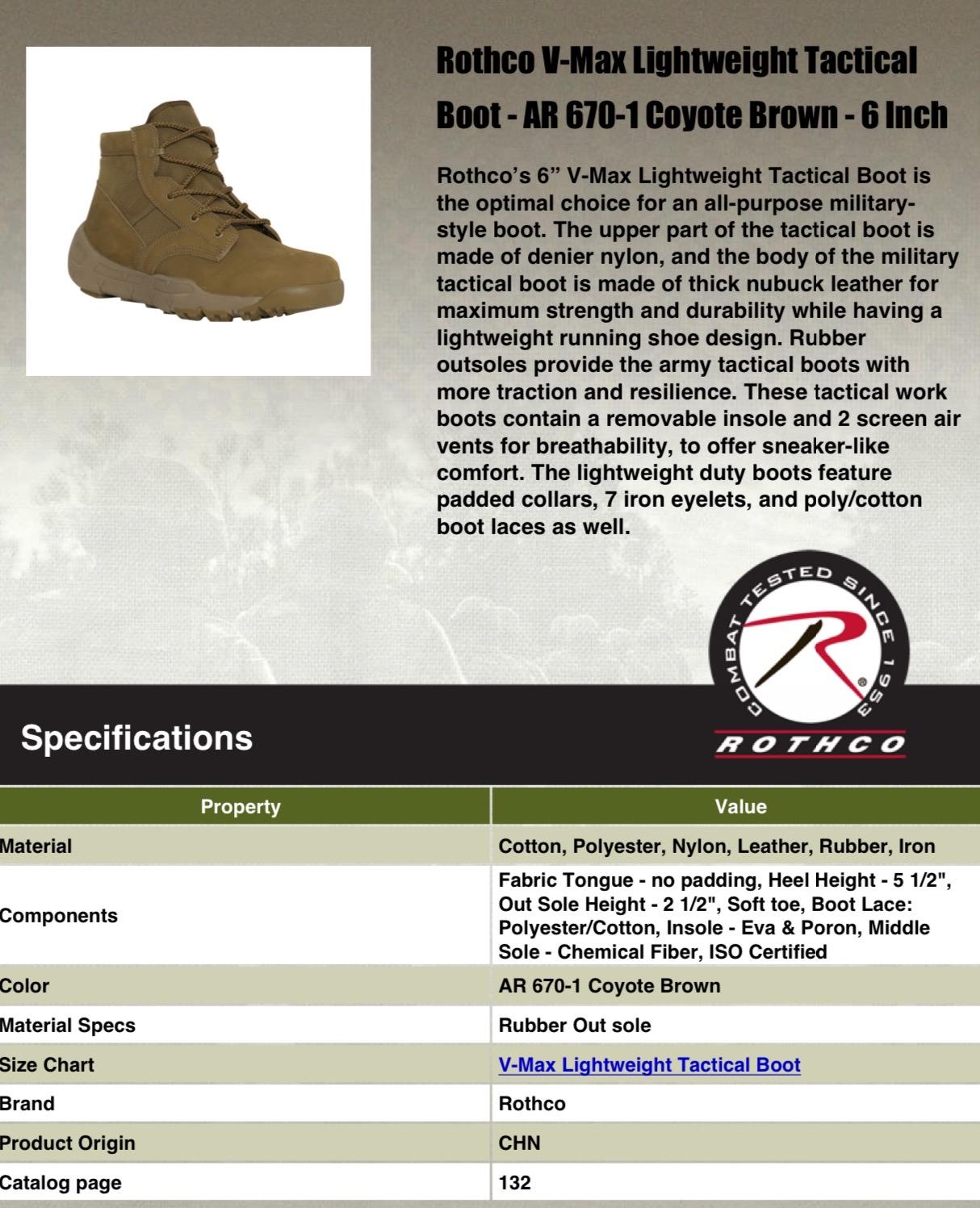- Additionally, the boots feature two screen air vents for breathability, keeping your feet cool and dry. Whether you’re on the job, hiking, or engaged in other demanding activities, Rothco’s V-Max Lightweight Tactical Boots deliver exceptional comfort and performance. Available in AR 670-1 compliant coyote brown, these boots combine functionality and style, making them an ideal choice for those who need reliable footwear for tough tasks. Designed with precision and built to withstand the harshest conditions, Rothco's collection of footwear and accessories combines durability, functionality, and unparalleled performance. From our Forced Entry Series which features our speedlace and waterproof technologies, to our V-Max Collection designed with lightweight running shoe soles, our diverse range of footwear provides unmatched comfort and protection for everyone from active-duty personnel to outdoor enthusiasts. With a rich heritage spanning over 7 decades, Rothco is the go-to brand for all things that keep you standing on your feet.