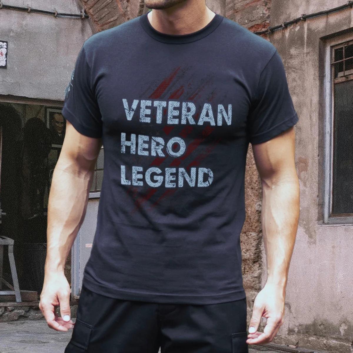 - Show your dedication and pride for your country with our Veteran Hero Legend T-Shirt! This patriotic shirt features a graphic design on the front with bold lettering and a distressed American flag, honoring military veterans and retired service members.
