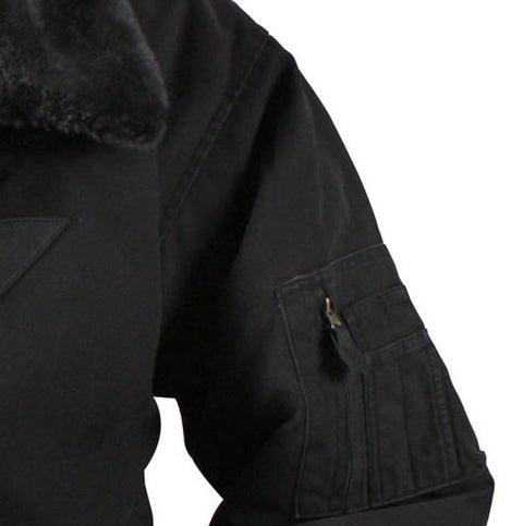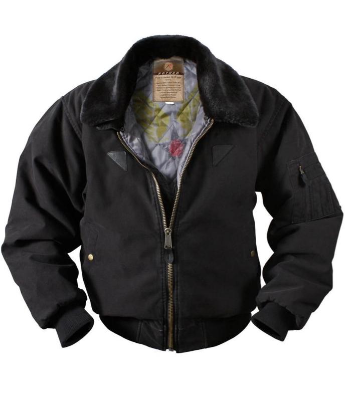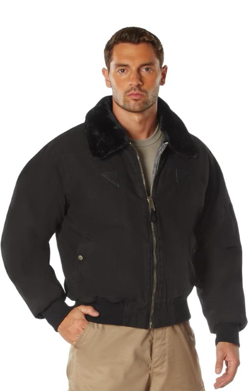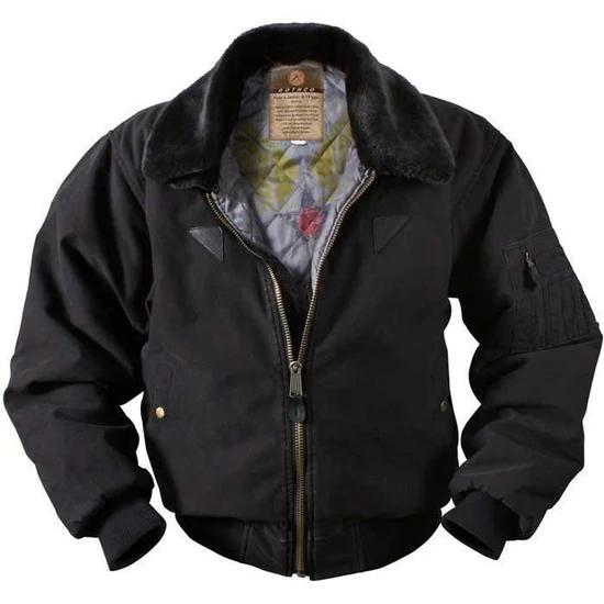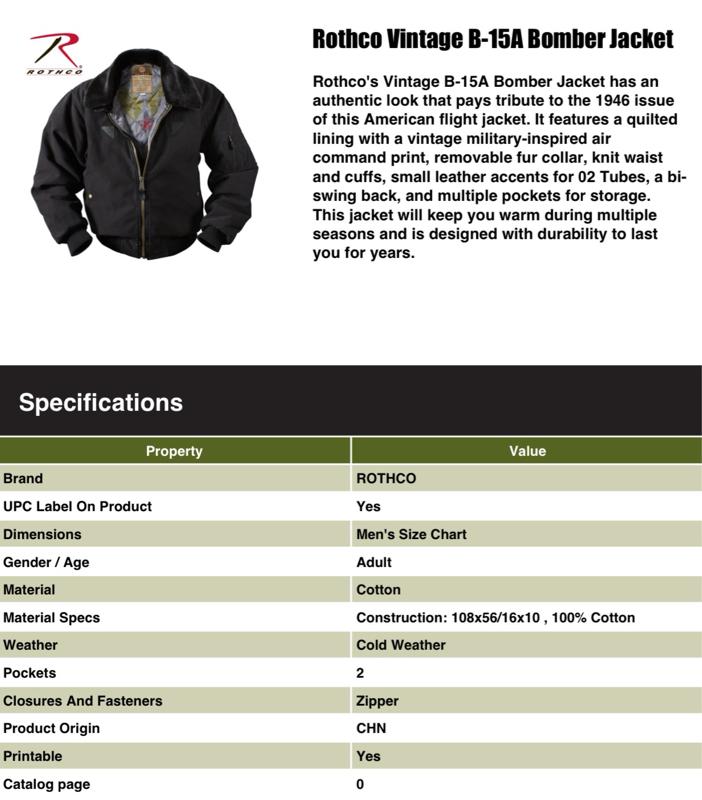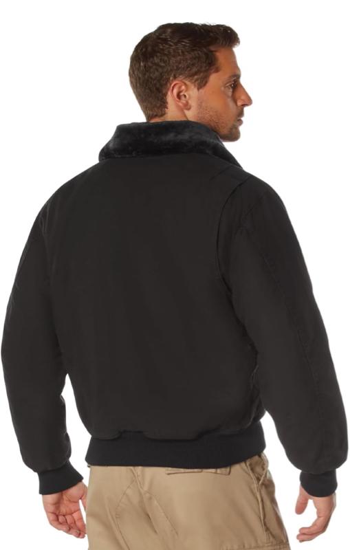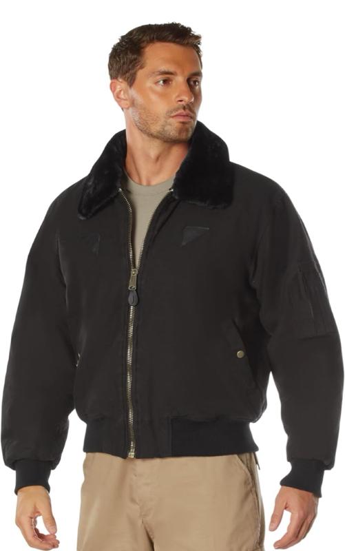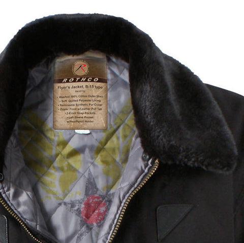 - Rothco's Vintage B-15A Bomber Jacket pays homage to the iconic American flight jacket with its authentic design. The warm quilted lining features a vintage inspired Air Command print, while the removable fur collar adds extra warmth and comfort. Ribbed knit waist and cuff accents provide flexibility, and the military jacket boasts ample storage with 2 front pockets with snap closures and a sleeve zippered pocket. Small leather accents on the chest enhance the jacket's authenticity.