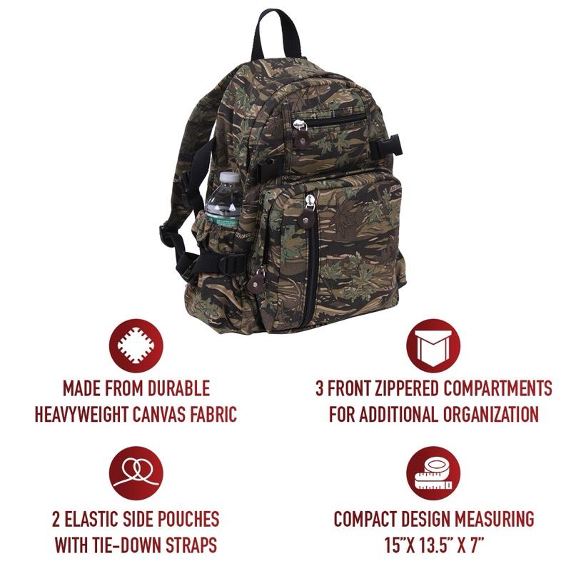 - Discover Rothco’s Vintage Canvas Compact Backpack, built with a compact yet feature-packed design for optimal storage. The main compartment features a two-way zipper closure for quick, full access to your everyday carry essentials. The military style travel backpack has a 24L capacity and measures 15 inch x 13.5 inch x 7 inch, providing ample storage space for your EDC gear.
