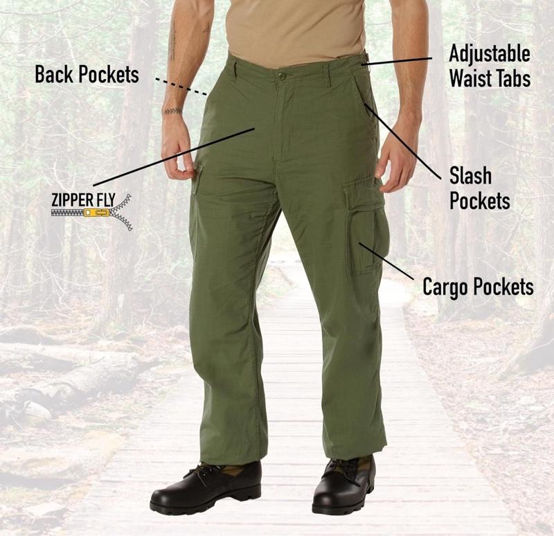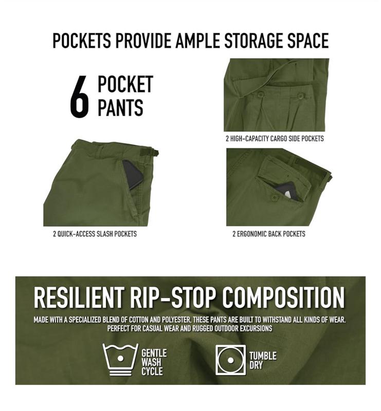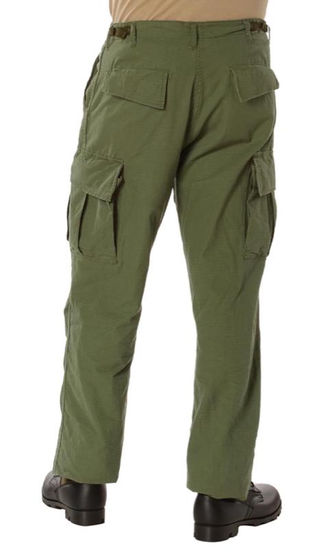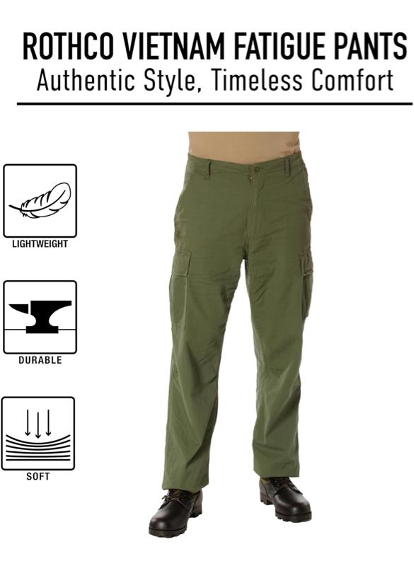 - Experience true vintage style with Rothco’s Vintage Vietnam Ripstop Fatigue Pants. Crafted from soft, lightweight cotton and inspired by the original Vietnam era uniform, these pants offer an iconic, timeless look that transcends generations. With six pockets, including two front slash pockets, two button-down bellow cargo pockets, and two button-down back pockets, you get all the storage you need for everyday carry (EDC) essentials. The adjustable waist tabs ensure a perfect fit no matter your body type. Whether you’re looking to get outdoor ready, geared up for work or just want a great everyday pant, Rothco’s Vintage Fatigue Pants are the right choice for you.
