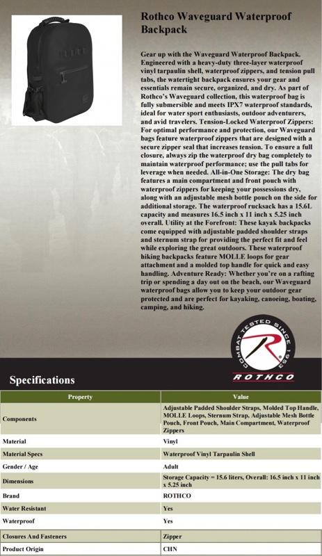 - Watertight Design: Engineered With A Heavy-Duty Three-Layer Waterproof Vinyl Tarpaulin Shell, Waterproof Zippers, And Tension Pull Tabs, Our Waveguard Waterproof Backpack Ensures Your Gear And Essentials Remain Secure, Organized, And Dry. As Part Of Rothco’s Waveguard Collection, This Waterproof Bag Is Fully Submersible And Meets IPX7 Waterproof Standards, Ideal For Water Sport Enthusiasts And Outdoor Adventurers.