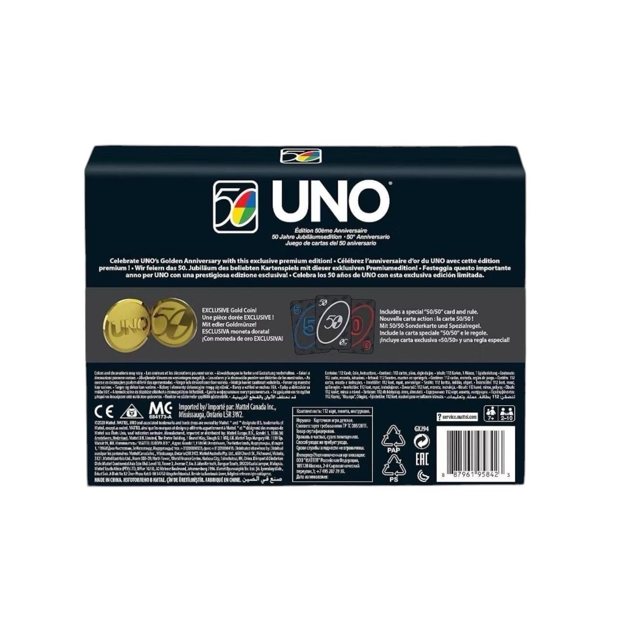 - The UNO card game is celebrating 50 years of bringing people together for fast fun and unpredictable twists with this premium Golden Anniversary edition of the classic card game. It arrives in a deluxe, specially designed box and includes cards with a velvety smooth finish. A commemorative golden medallion collector coin is included, and when someone plays the special "50/50" card you flip it to see who will have to draw extra cards! Just like the last 50 years, when a player is down to one card, they must yell, "UNO!" Colors and decorations may vary.